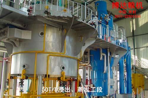 搏達浸出設備包括浸出系統、蒸脫系統、蒸發系統、冷凝系統和尾氣回收系統。主要的原理就是采用合適的溶劑將料胚中的油萃取出來,然后除去混合油中的溶劑。