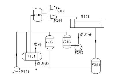 油脂浸出工藝過程為:1、油料裝入浸出罐V201;2、溶劑泵P201將4號溶劑注入浸出罐浸泡油料;3、溶劑泵P201從浸出罐抽出混合油打入蒸發罐V203;4、聯通浸出罐與壓縮機P204吸氣口,使粕中殘溶氣化,進入壓縮機,經壓縮、冷凝器E201冷凝液化,溶劑回流到溶劑周轉罐V204,再循環使用。粕排出浸出系統。5、混合油進入蒸發系統,使4號溶劑蒸發后與毛油分離。溶劑蒸氣經壓縮液化后循環使用。毛油排出浸出系統。